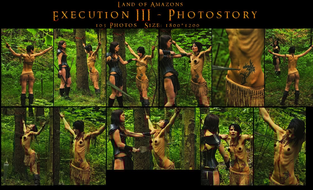 Story: Bound to two trees, how sexy Lakea looks in this? I love the view! And Stella seems to enjoy the view too! She comes close to Lakea, and grabs her tiny top away from Lakea´s skinny body! Then she shots an arrow into her chest, and comes closer and used her sword! At the End, Lakea still hanging in her binds with a lil bit less life in her body!